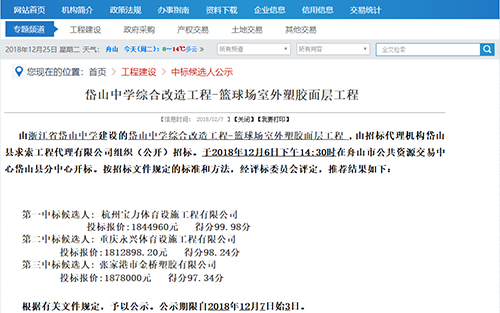 2018年12月6號中標岱山中學室外籃球場塑膠面層改造工程公示