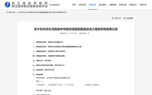 2018年7月5號中標杭州長河高級中學田徑場塑膠跑道改造工程項目公告