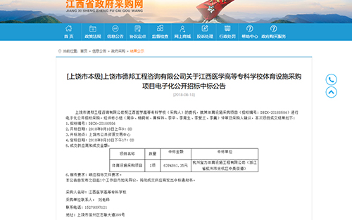 2018年8月13日中標江西醫學高等專科學校體育設施采購項目公告
