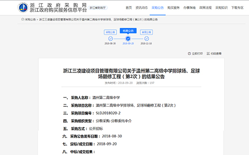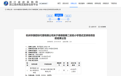 2018年9月4日中標泰順縣第二實驗小學籠式足球場建設項目公告