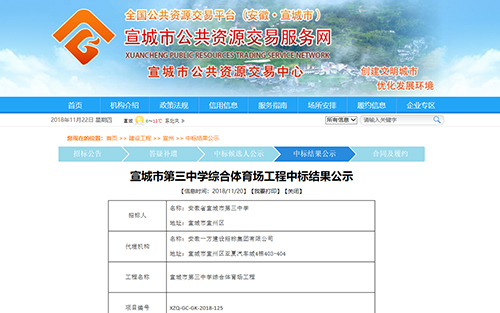2018年11月20日中標宣城市第三中學綜合體育場建設工程公告