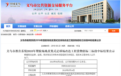 2018年8月22日中標義烏市教育系統塑膠場地及籠式足球場改造工程項目公示