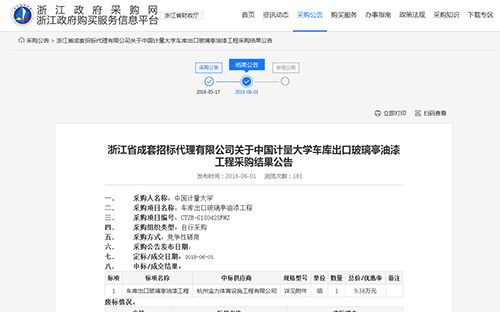2018年6月1日中標中國計量大學車庫出口玻璃亭油漆工程公告