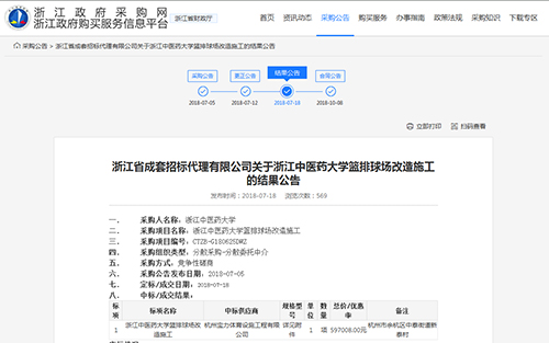 2018年7月18日中標浙江中醫藥大學籃球場,排球場改造施工項目公告