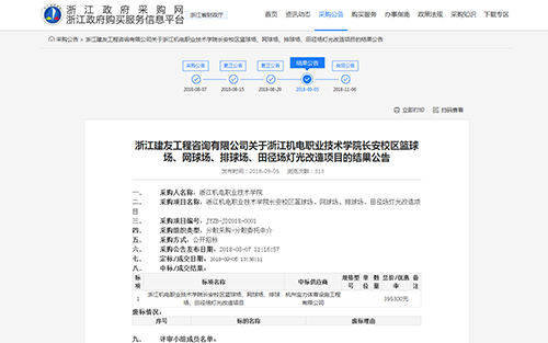 2018年9月5日中標浙江機電職業技術學院長安校區籃球場,網球場,排球場,田徑場燈光改造項目公告