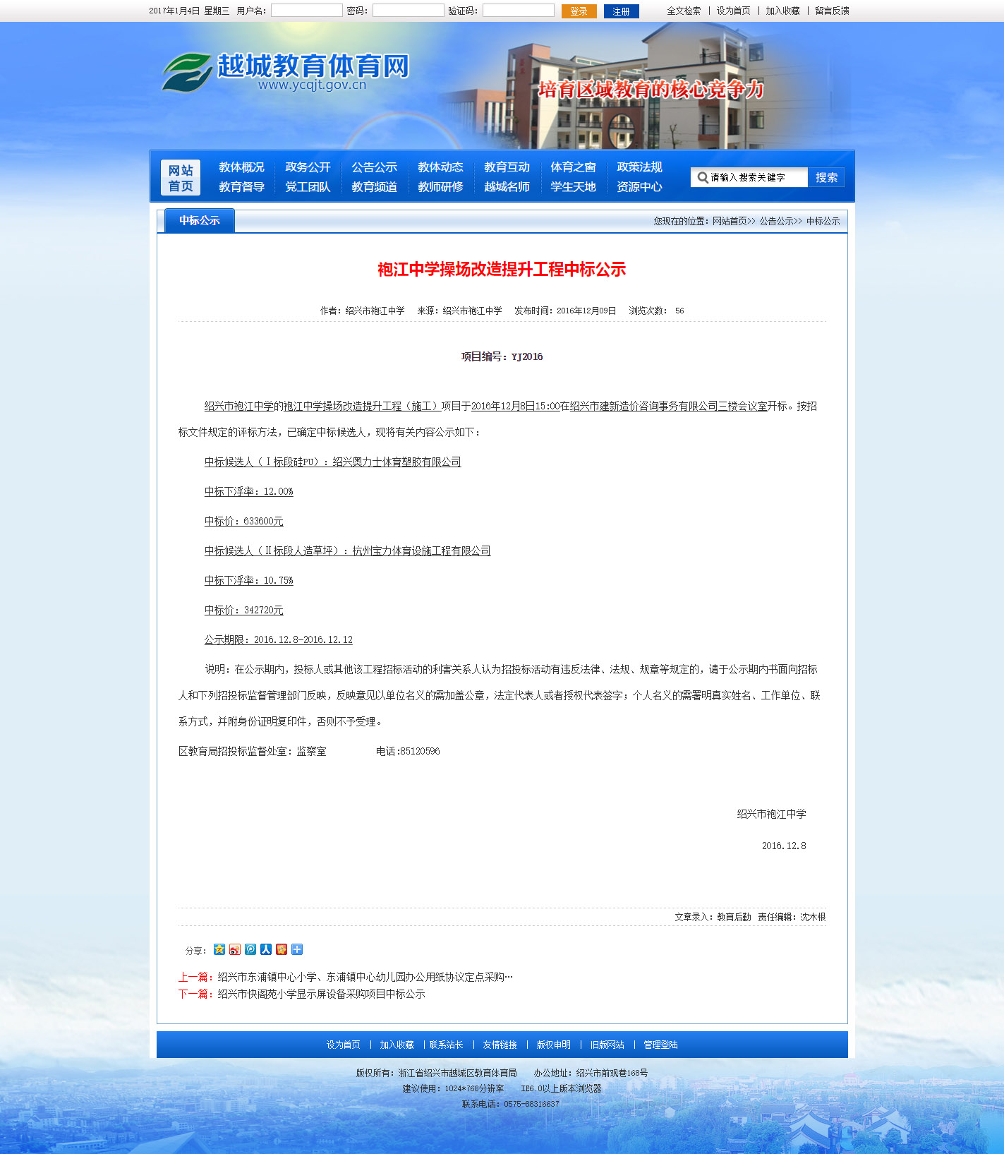 上一篇:2016年6月16日中標浦沿中學運動場面層更換安裝及西興小學、濱興學校足球場人造草坪安裝采購項目